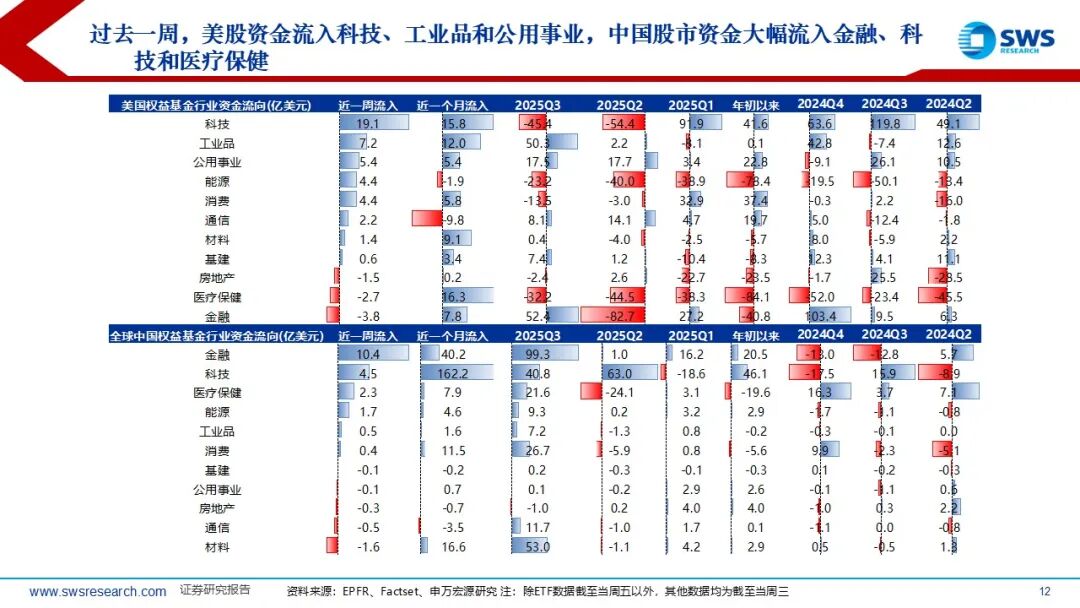 全球资金流向跟踪:截止到2025/10/23,过去一周来看,内资和外资均流出中国股市;海外资金主动和被动方面,海外主动基金过去一周流出1.52亿美元,而海外被动基金过去一周流出3.67亿美元;内资和外资方面,外资过去一周流出5.19亿美元,而内资流出4.81亿美元。过去一周,全球资金流入货币市场基金,发达股市流入明显,新兴股市小幅流出;固收基金方面,美国流入明显,本周流入111.7亿美元;权益基金方面,美国市场本周大幅流入122.9亿美元。过去一周,美股资金流入科技、工业品和公用事业,中国股市资金大幅流入金融、科技和医疗保健。