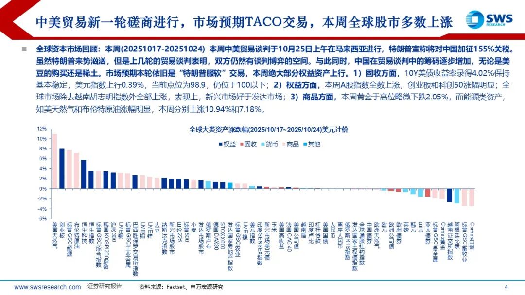全球资本市场回顾:本周(20251017-20251024) 本周中美贸易谈判于10月25日上午在马来西亚进行,特朗普宣称将对中国加征155%关税。虽然特朗普来势汹汹,但是上几轮的贸易谈判表明,双方仍然有谈判博弈的空间。与此同时,中国在贸易谈判中的筹码逐步增加,无论是美豆的购买还是稀土。市场预期本轮依旧是“特朗普服软”交易,本周绝大部分权益资产上行。1)固收方面,10Y美债收益率录得4.02%保持基本稳定,美元指数上行0.39%,当前点位为98.9,仍位于100以下;2)权益方面,本周A股指数全数上涨,创业板和科创50涨幅明显;全球市场除去越南胡志明指数外全部上涨,表现上,新兴市场好于发达市场;3)商品方面,本周黄金于高位下跌2.05%,而能源类资产,如美天然气和布伦特原油涨幅明显,本周分别上涨10.94%和7.18%。