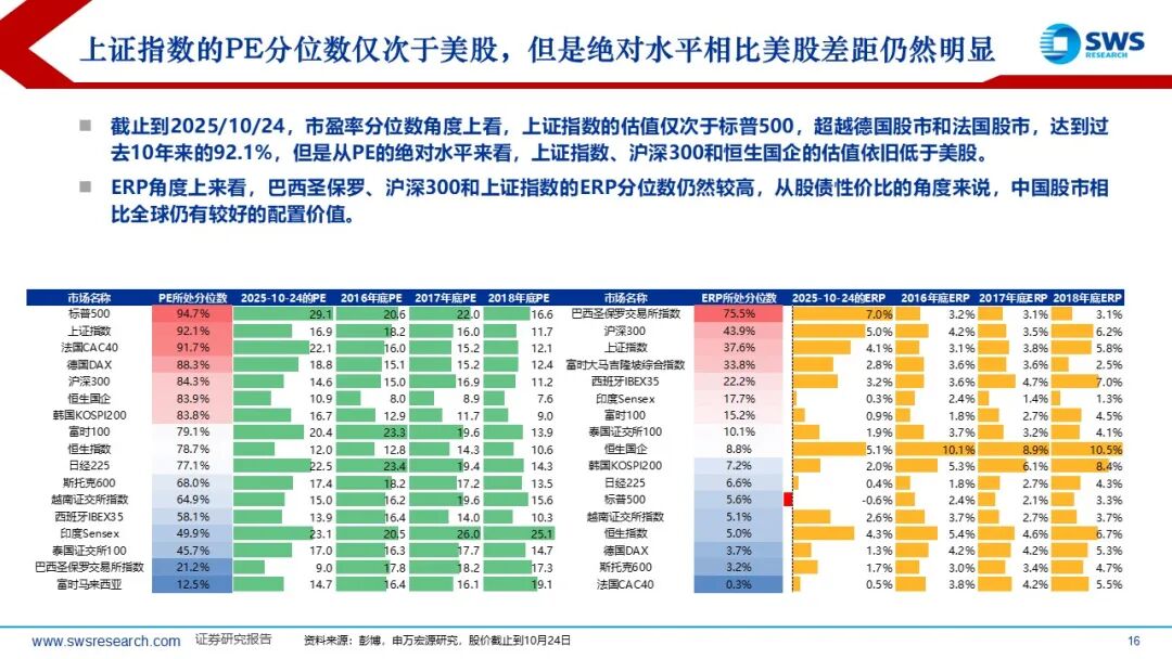 全球资产性价比指标:贵金属风险调整后收益分位数创下新高后,本周出现了回调。估值分位数方面,截止到2025/10/24,市盈率分位数角度上看,上证指数的估值仅次于标普500,超越德国股市和法国股市,达到过去10年来的92.1%,但是从PE的绝对水平来看,上证指数、沪深300和恒生国企的估值依旧低于美股。ERP角度上来看,巴西圣保罗、沪深300和上证指数的ERP分位数仍然较高,从股债性价比的角度来说,中国股市相比全球仍有较好的配置价值。风险调整收益方面,截止到2025/10/24,标普500的风险调整后收益所处分位数由44%上升至51%,纳斯达克的风险调整后收益所处分位数由44%上升至47%。沪深300的风险调整收益分位数从69%上升至75%。发达市场和新兴市场的风险调整收益分位数均边际上升。GSCI贵风险调整后收益分位数创下历史新高后,本周出现了回调。