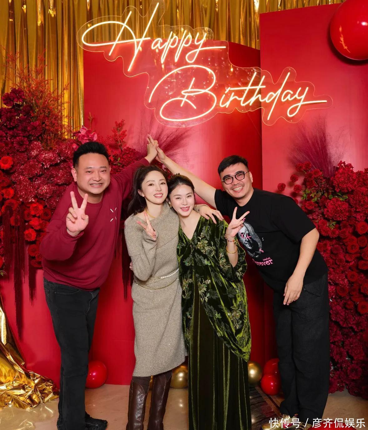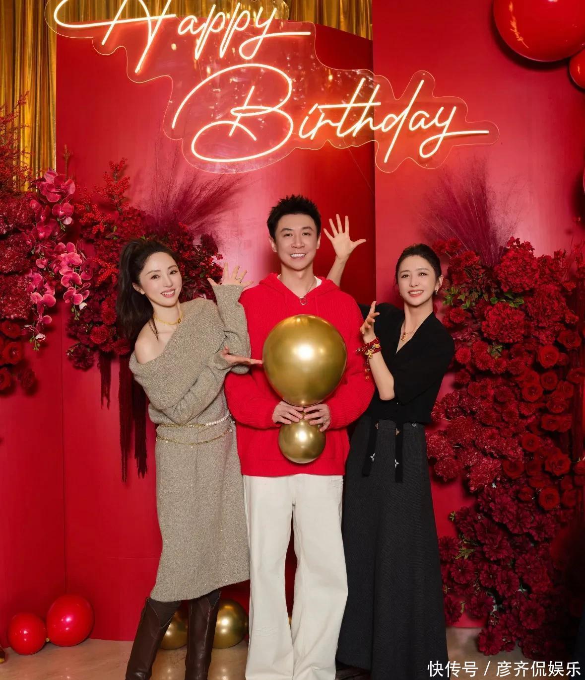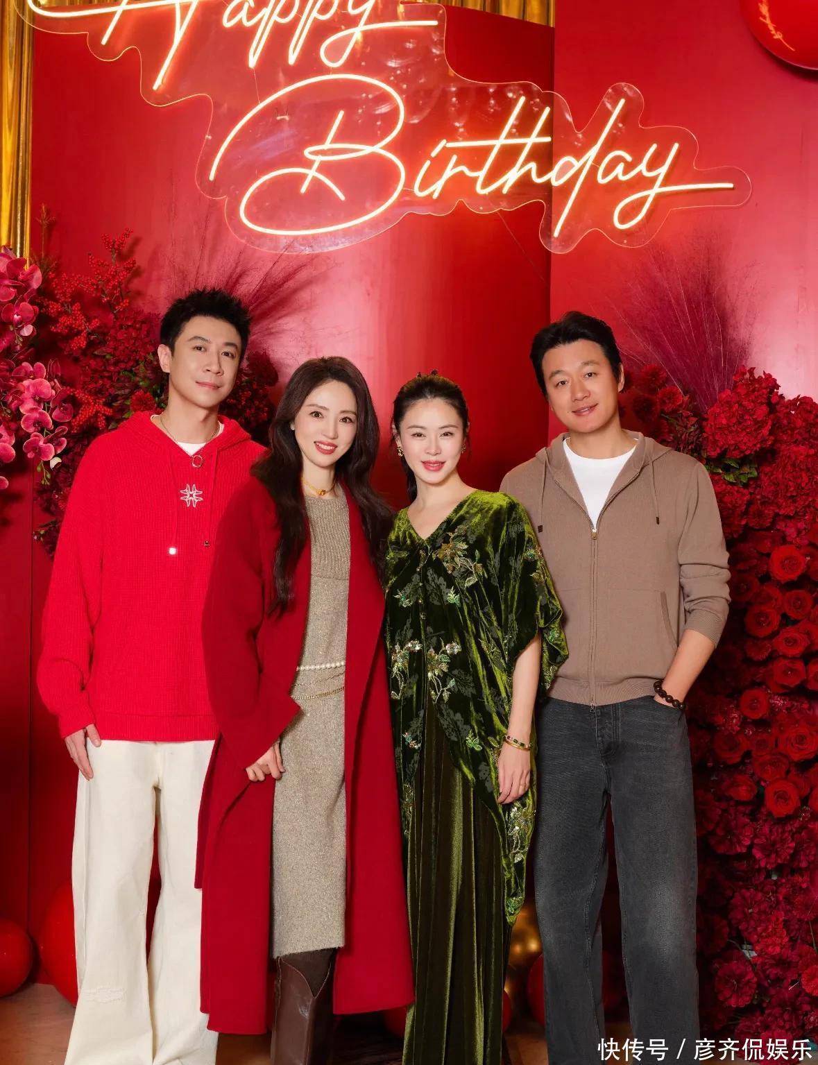 寿星张维伊身着一袭红装,英姿飒爽,新发型更添清爽利落,状态极佳,董璇一袭灰裙,温婉地立于丈夫身旁,二人结婚尚不足一年,举手投足间却满是自然默契与夫妻相。